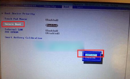 2、完成后继续移动方向键选择boot选项卡,在下方找到“Secure Boot”将其由“Enabled”改成“Disabled”,如图所示:
