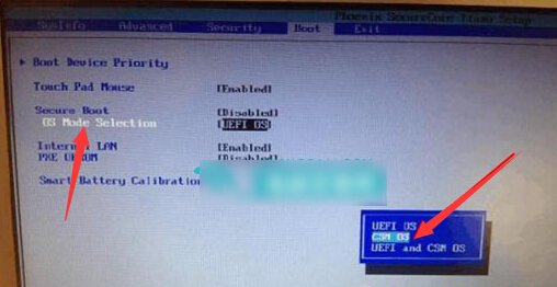 3、随后在“Secure Boot”下方会有新的选项“OS Mode Selection”出现,选择“OS Mode Selection”,在弹出的窗口中将“UEFI OS”改成“CSM OS”,如图所示: